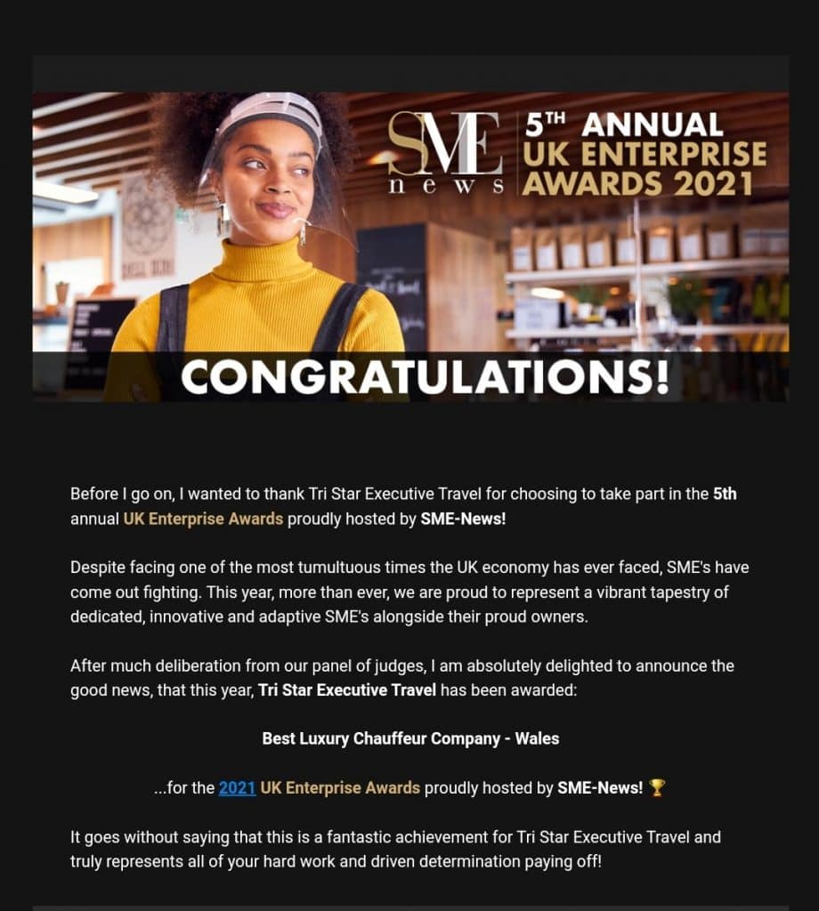 We are proud to announce that we have been awarded title of best luxury chauffeur company in Wales, in the 2021 UK enterprise awards